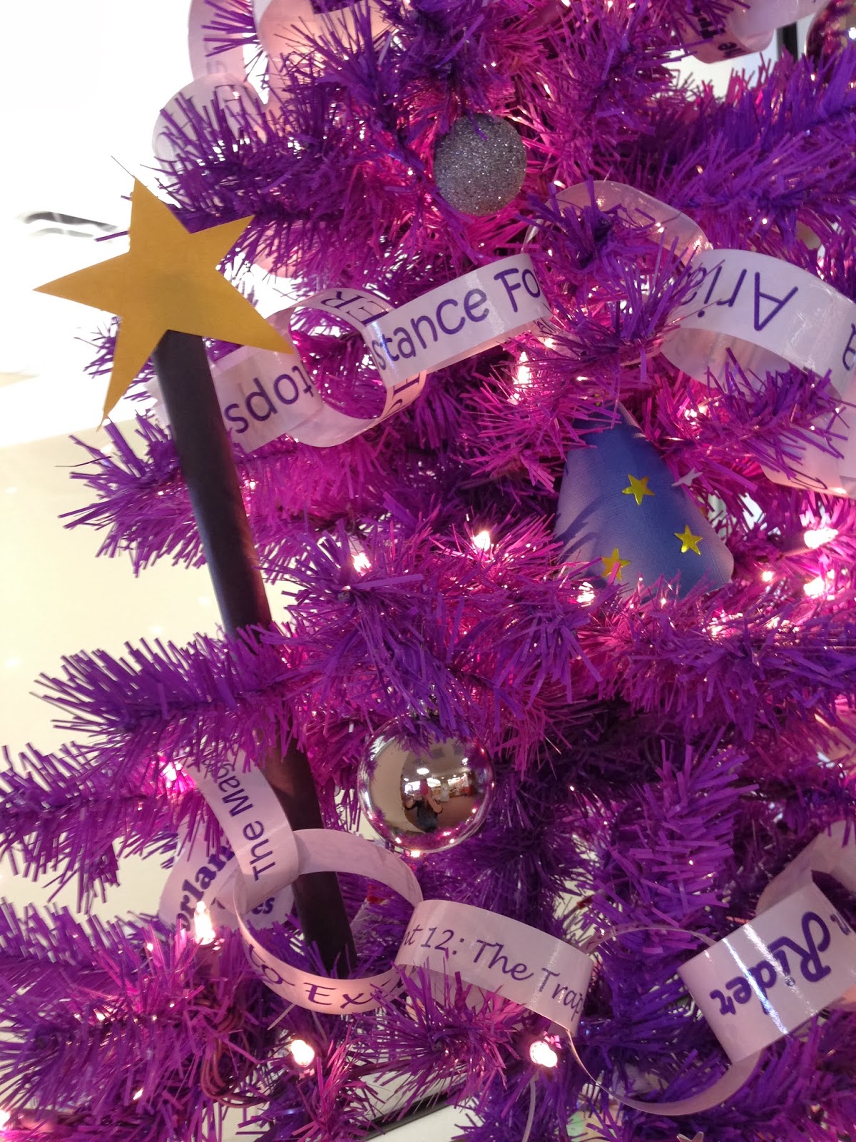 The top of the tree is adorned with a large purple dragon foot from my son’s Skylanders Halloween costume. Each of the paper chain links has a title from a book in our High Fantasy genre section, all in different purple fonts. The ornaments include a homemade wand and two homemade wizard caps. I am planning to dig in my kids’ toybox this weekend to see if I can find some other fantasy-related ornaments. The presents under the tree are books from the High Fantasy genre section.